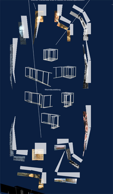 Gibt es heute noch einen vermittelnden Überbau, der die Menge der gesammelten Gedanken verbindlich und stabil ordnet? Entspricht es uns heute nicht viel eher, hierin fragile und ephemere Konstruktionen zu sehen? Muß man nicht in Frage stellen, daß diese immateriellen Relationen in massiven Formen abgebildet werden? Uns erscheinen solche Ordnungsschemata eher vergleichbar den Sternbildern, in denen der Mensch von seinem Standpunkt aus den Sternenhimmel, zu seiner eigenen Orientierung in fiktionalen aber auch poetischen Bildern ordnet. Die Objekte werden weitgehend vereinzelt in kugelförmigen Vitrinen, frei im Raum hängend, präsentiert. Die Beziehungen der Objekte untereinander und ihre thematische Zusammenfassung wird durch textile gestaltete Banner gegeben. Dieser grafische Leitfaden schlägt anstelle eines Zwangsrundgangs eine Entdeckungsreise vor.