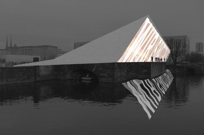 die sich mit einer monumentalen Glaswand zur Wasserfläche des