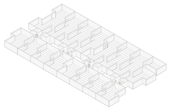 Der Baukörper ist weitgehend geschlossen, da keine Belichtung der