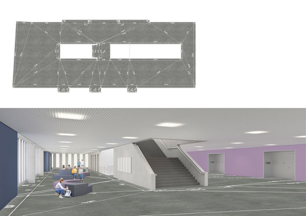 Um die visuell verborgene mathematische Existenz des Gebäudes sichtbar zu machen, schlägt das Projekt vor, im 2. Obergeschoß des Standortes A2 MATH eine dauerhafte grafische Installation in die Versiegelung des Estriches einzuarbeiten. Sie zeigt Maßlinien, die die Bodenfläche in Dreiecke zerlegen und ist mit den Zahlenwerten des Naturmaßes beschriftet. Linienmuster und Zahlen geben nicht nur den Befund der Naturaufnahme, sondern bilden vor allem auch eine dekorative Strukturierung der Bodenfläche und des Raumes. Benannt ist die Installation nach den Angaben des Raum- stempels, der als Ziel vorgibt: Die Fläche A sei 815,87m² und nach dem Mathematiker Heron von Alexandria, dem wir die schöne und praktische Formel verdanken. Vielleicht werden die jeweils jüngsten Generationen von Studieren- den als Zeitvertreib prüfen, inwieweit die Realität der idealen Vorgabe des virtuellen Modells, die im Titel festgeschrieben ist, entspricht ...