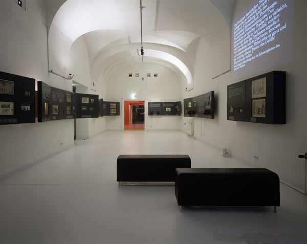Brecht & Piscator. Experimentelles Theater im Berlin der Zwanzigerjahre. Die Gestaltung der Ausstellung soll die Methoden der beiden großen Theatermacher Bertolt Brecht und Erwin Piscator differenzierbar machen. Im roten Eingangsbereich werden die für das politische und künstlerische Schaffen beider Persönlichkeiten prägenden Erfahrungen des 1. Weltkriegs thematisiert. Daran anschließend ist jedem der Beiden ein eigener Saal gewidmet. Für Piscator, der sein Publikum mit optischen Sensationen überwältigte und hierfür keinerlei technischen Aufwand scheute, wurde eine Art ‚Raummaschine’ inszeniert: die vorhandenen Gewölbe wurden zu einer unregelmäßigen Kuppel umgewandelt. Der übrige Raum wurde ähnlich einem „unsichtbaren Kino“ durch schwarze Farbgebung ausgeblendet. Brecht versuchte den Zuschauer im Gegensatz dazu eher durch Brechung der Illusion zu überzeugen und ihn zu distanzierter Analyse anzuregen. Die Exponate werden in diesem Saal auf klappbaren Trägern thematisch zusammengefasst. Dieser Raum ist ganz in weiss gehalten, sodass dessen physische Präsenz geometrisch objektiviert erlebbar wird.