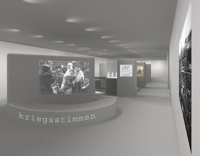 Der andere Vorschlag ein Ensemble von schalldichten Räumen. Die Gestaltung ist hier zu gunsten des akustischen Erlebens reduziert. Die Trennwände sind dabei in drei übereinander liegende Zonen strukturiert, wovon die mittlere die Objekte, die anderen Raumtexte und Projektionen aufnehmen sollten.
