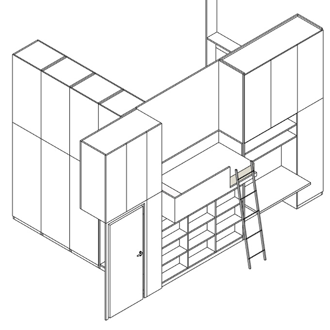 Eine alltägliche Aufgabe: Ein Zimmer einer Gründerzeitwohnung muss für die nächsten Jahre in einen Schrankraum und zwei Kinderzimmer geteilt werden. Um möglichst viel Raum zu geben, wurden die Schrankwände als doppelgesichtige Wohnreliefs konzipiert.